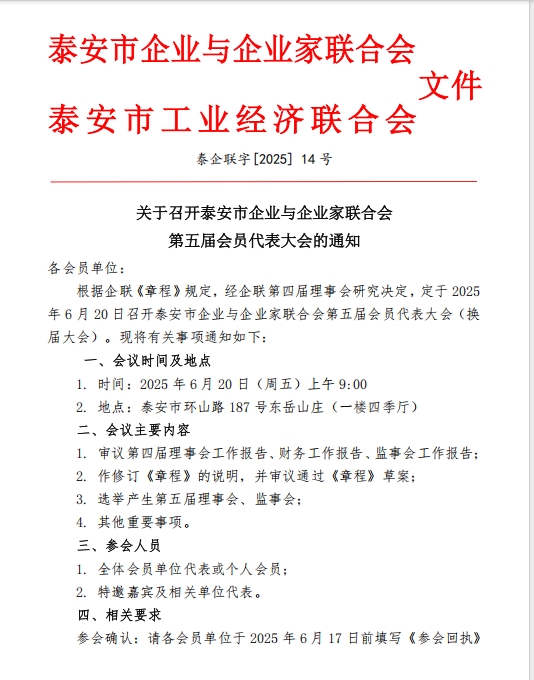 召開(kāi)泰安市企業(yè)與企業(yè)家聯(lián)合會(huì)第五屆會(huì)員代表大會(huì)